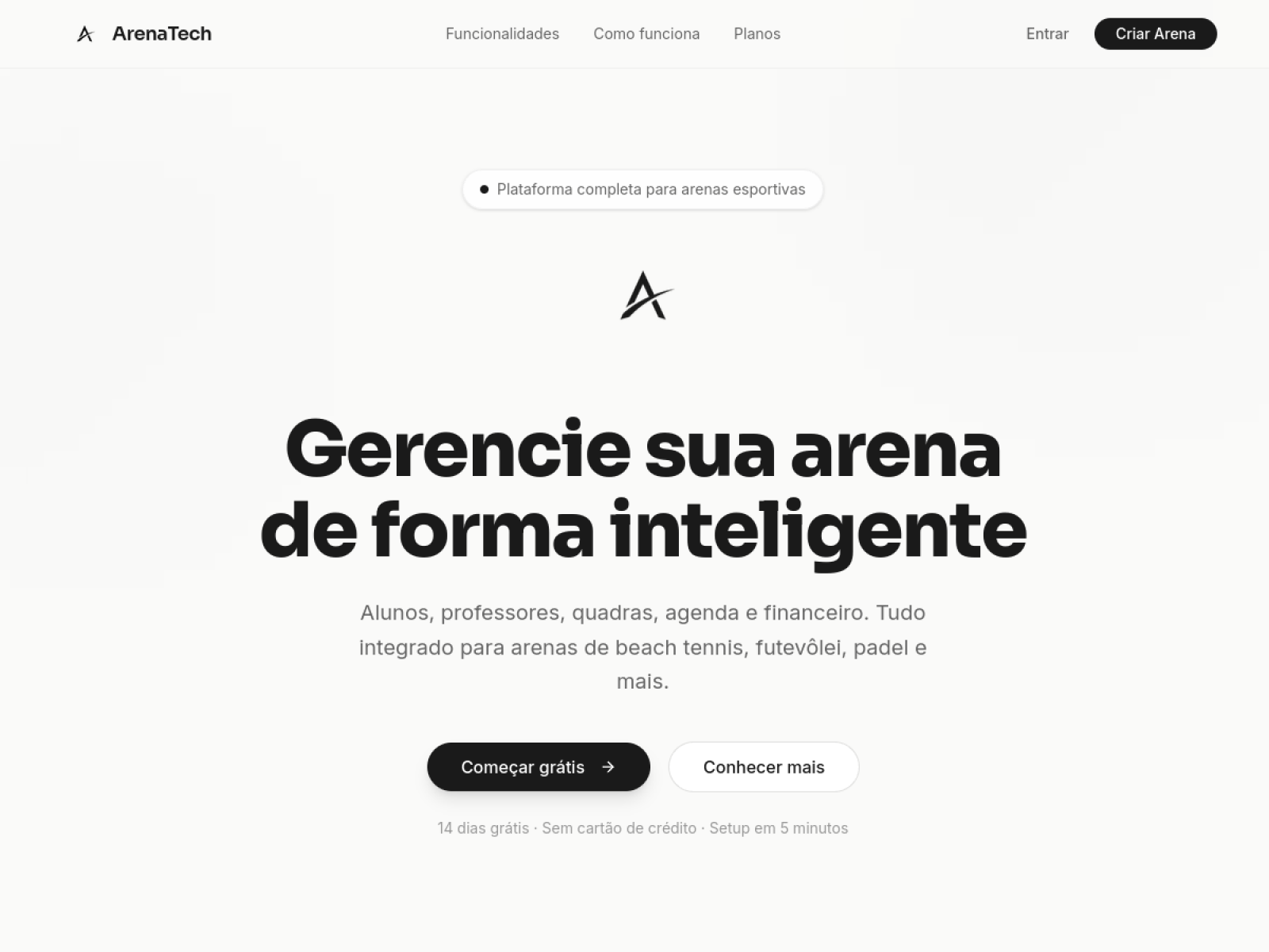 Plataforma completa de gestão para arenas esportivas. Alunos, professores, quadras, agenda e financeiro integrados para beach tennis, futevôlei e padel.